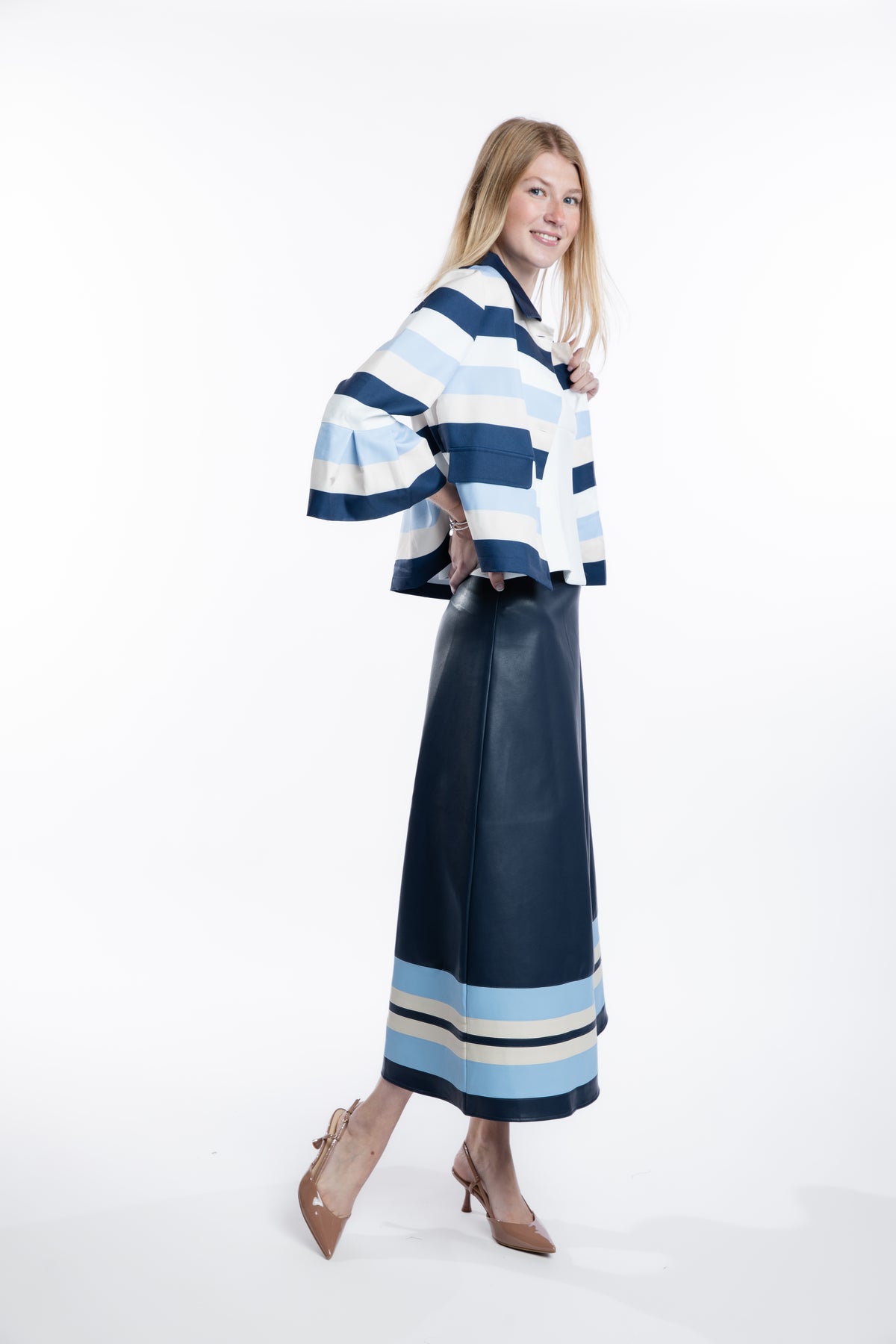The Hélène Navy Midi Skirt is a striking blend of modern elegance and refined detail. Crafted in a lightweight faux leather with beautiful movement, this flattering midi silhouette is finished with a signature stripe at the hem in Navy, Sand, and Blueberry for an unexpected pop of color. Sophisticated yet bold, Hélène is a standout piece designed to elevate even the simplest spring look.