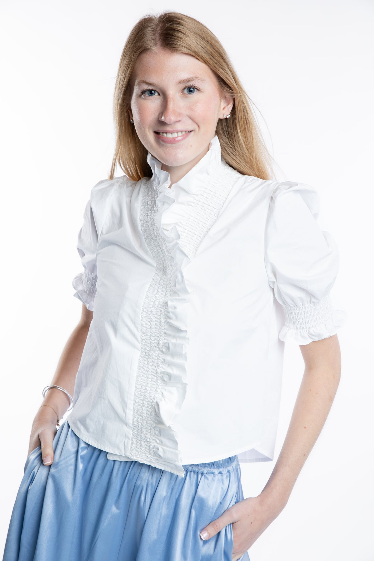 Meet Kiki - our standout shirt of the season. Cut from crisp white cotton and finished with soft ruffle details, this beautifully tailored top brings instant elegance to everyday dressing. Designed to go with everything, Kiki is stunning with our skirts or layered under the Milly blazer for a polished, feminine look that transitions effortlessly from day to night.