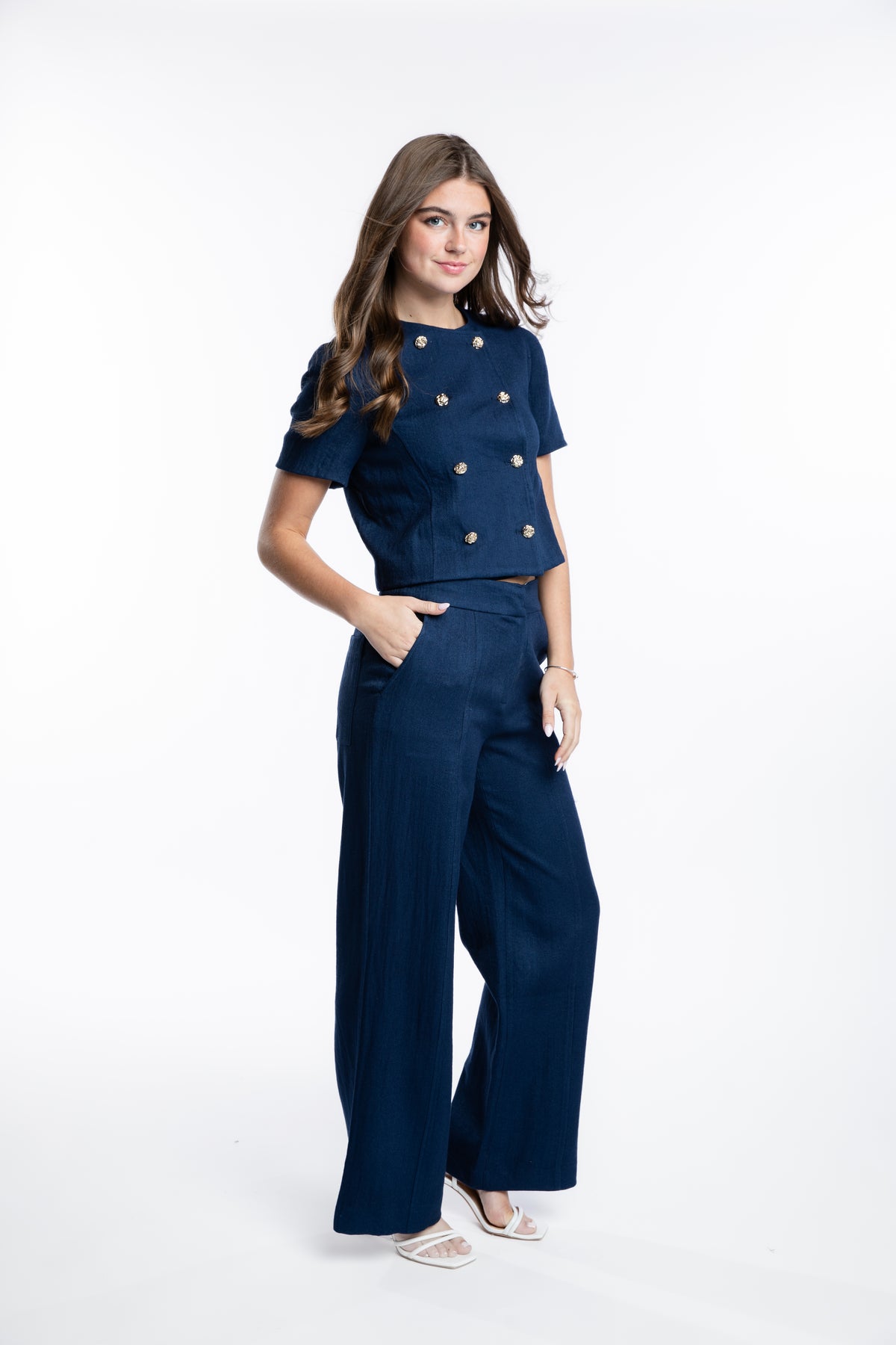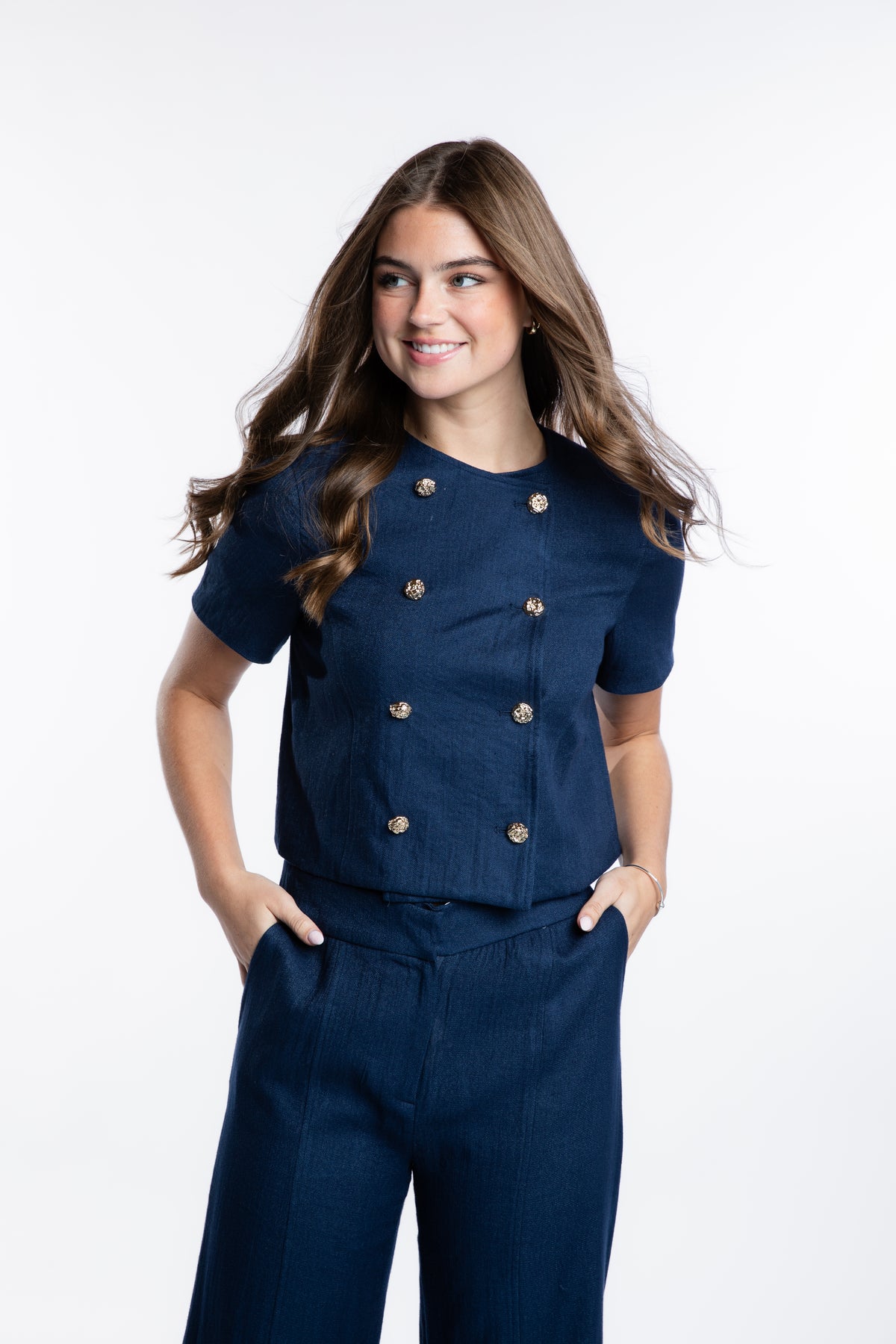 The Molly short-sleeve double-breasted jacket in a refined light herringbone brings tailored polish with an easy, modern feel. Designed with a flattering structured fit and lightweight fabrication, it's ideal for warm days when you still want to look sharp and pulled together. Worn with the Nelly pant, it creates a sleek, sophisticated set that moves effortlessly from meetings to dinner plans.